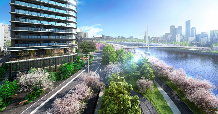 本物件の計画地は、大阪を代表する桜の名所である「大川」が南と東の二方向に広がるリバーフロントの立地です。また、京都の「祇園祭」、東京の「神田祭」と並ぶ日本三大祭りである「天神祭」の舞台でもあり、煌びやかな船が行きかう「船渡御」や、祭りのクライマックスを飾る奉納花火を目の前に望む、まさに水都大阪の特等席と呼ぶにふさわしい場所です。