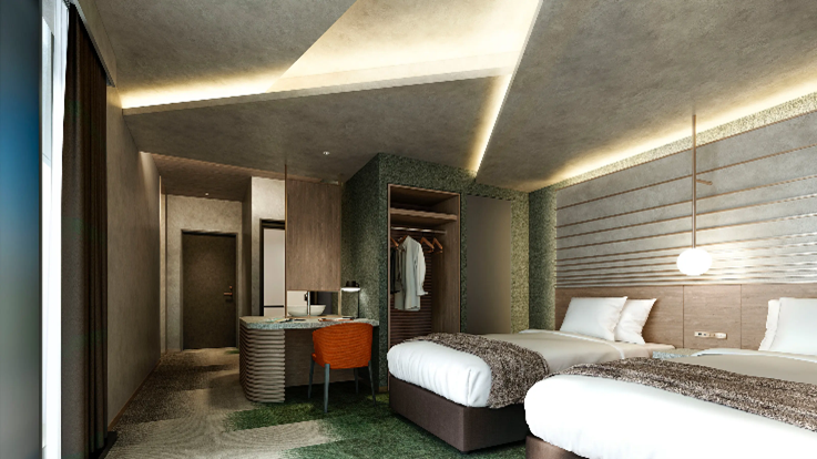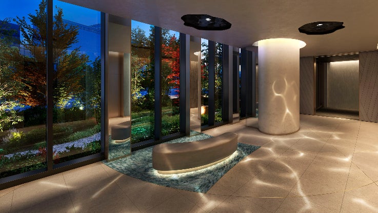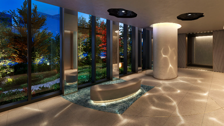 本物件では、水都大阪の美しい風景の魅力を取り込みます。外観(ファサード)は、眼前に流れる大川の水面と空を緩やかに繋ぐデザインで、周辺との一体感を表現。共用空間には「水の性質」をデザインモチーフに、1階エントランスホールには住宅として初めて※「実際の水を用いて揺らぎを表現する波紋照明演出《HAMON》」を採用しました。床面・壁面に水の波紋を投影することで大川の水辺がもたらす心地よさを建物内部に引き込み、上質なくつろぎの時間を過ごせる迎賓空間に仕上げます。
