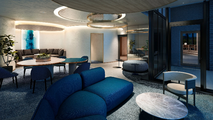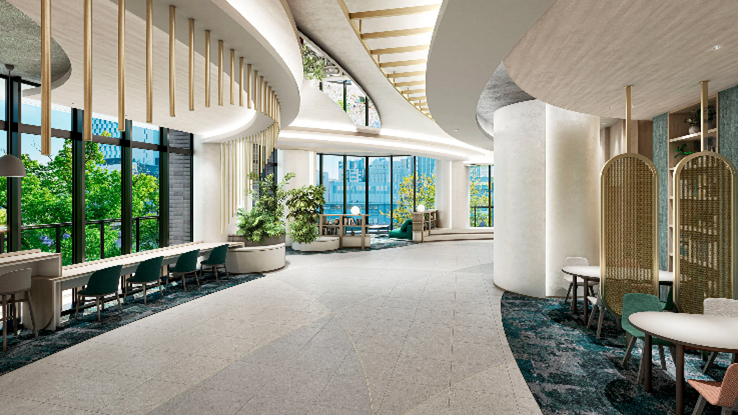 また、3階にはコンセプトの異なる2つのラウンジ、ゲストルーム、集会室などの共用施設を配置し、南面・東面に大きく開口部を設けることで、大川の水と緑、春の桜、ダイナミックなパノラマ眺望を堪能できる設えとしています。
