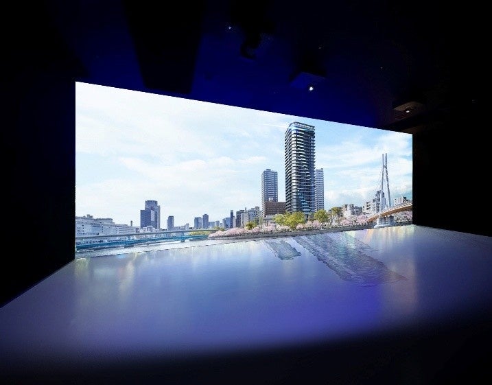 壁面だけでなく、床面も映像を投写するダイナミックシアターシステムで、本物件のコンセプトムービーを上映。大川の南・東2方向リバーフロントに位置し「水都大阪の特等席」である立地や、水都大阪の水と緑の美しさと開放感を最大限に取り込む外観・共用空間デザインといった本物件の魅力を迫力ある映像表現でお伝えします。