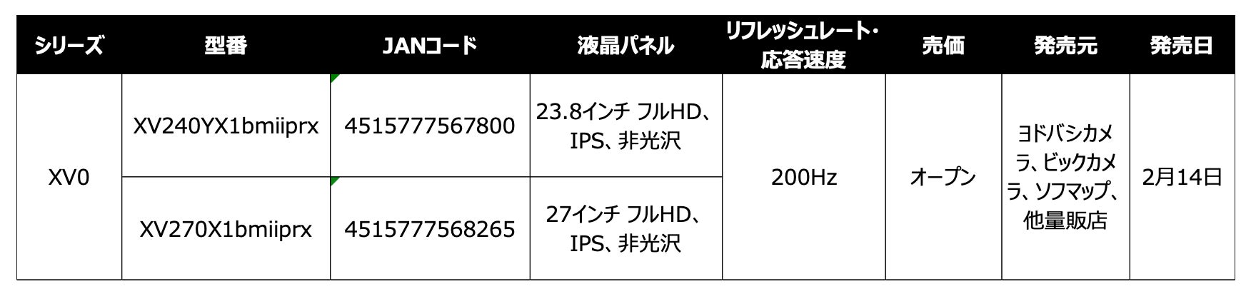 日本エイサー株式会社(本社:東京都新宿区、代表取締役社長:ボブ・セン)は、ゲーミングブランドNitroより、リフレッシュレートを従来機種の180Hzから200Hzにパワーアップした23.8インチ「XV240YX1bmiiprx」、27インチの「XV270X1bmiiprx」の計2機種を、本日2月14日より発売いたします。これらの機種は、ヨドバシカメラ、ビックカメラ、ソフマップなどの主要家電量販店にて順次発売します。
