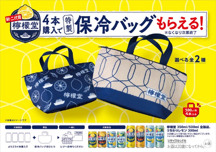 期間中、全国のスーパーマーケットやドラッグストアなどの対象店舗で「檸檬堂」製品をどれでも4本購入で、「檸檬堂特製保冷バッグ」をプレゼントします※。