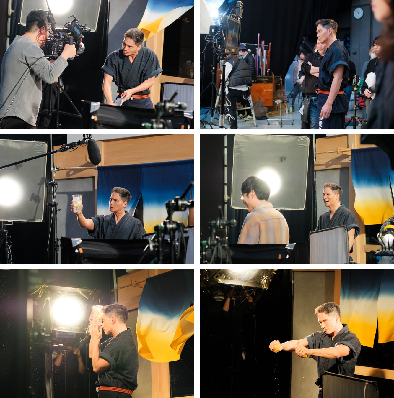 二代目檸檬堂店主として登場した市原隼人さん。かねてより檸檬堂の大ファンと公言するほど檸檬堂を愛飲される市原さんは、生まれ変わった二代目檸檬堂を一人でも多く届けたい熱意に溢れています。「全力で届けたい!」という熱い思いを表現するために気合を入れたり、自ら映像チェックをしながらスタッフと演技について議論したりと熱量の高さが伺えました。特に、レモンを削るシーンでは、市原さんの無我夢中の演技でスタジオの暖房を切るほどの熱気に包まれる場面や演技に熱が入りすぎてスタッフのカット音を遮ってしまい笑いが起こる場面もあり、緊張感と笑いがある雰囲気で撮影が進行しました。
