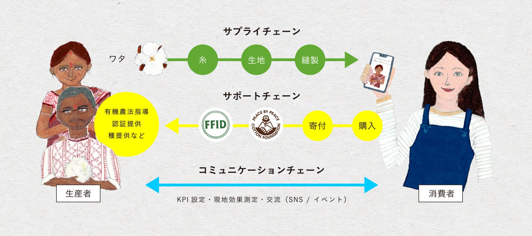 コットン生産者から糸や生地、製品の製造者を通じて消費者へつながる「サプライチェーン」を透過的に繋げると共に、消費者の購買代金の一部を支援パートナーを通じて生産者へのオーガニックへの移行支援に活かす「サポートチェーン」を構築。更に生産地での支援効果をアセスし、消費者から可視化することで、支援プログラムの調整や、生産者と消費者との交流を進めていく「コミュニケーションチェーン」と、3重にチェーンを生産者と消費者間でつなぐことで、生産者支援への消費者の参加を促し、継続的かつ多面的な支援の実現を目指します。