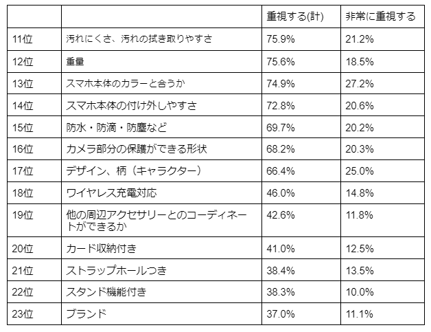 重視する計が高い順に見ていくと、11位「汚れにくさ、汚れの拭き取りやすさ」75.9%、12位「重量」75.6%、13位「スマホ本体のカラーと合うか」74.9%となります。