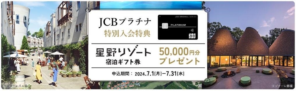 株式会社ジェーシービー (本社:東京都港区、代表取締役兼執行役員社長:二重 孝好、以下:JCB)は、2024年7月1日(月)から7月31日(水)の期間中、JCBプラチナへ新規入会されたお客様を対象に、「星野リゾート宿泊ギフト券5万円分プレゼントキャンペーン」を実施します。