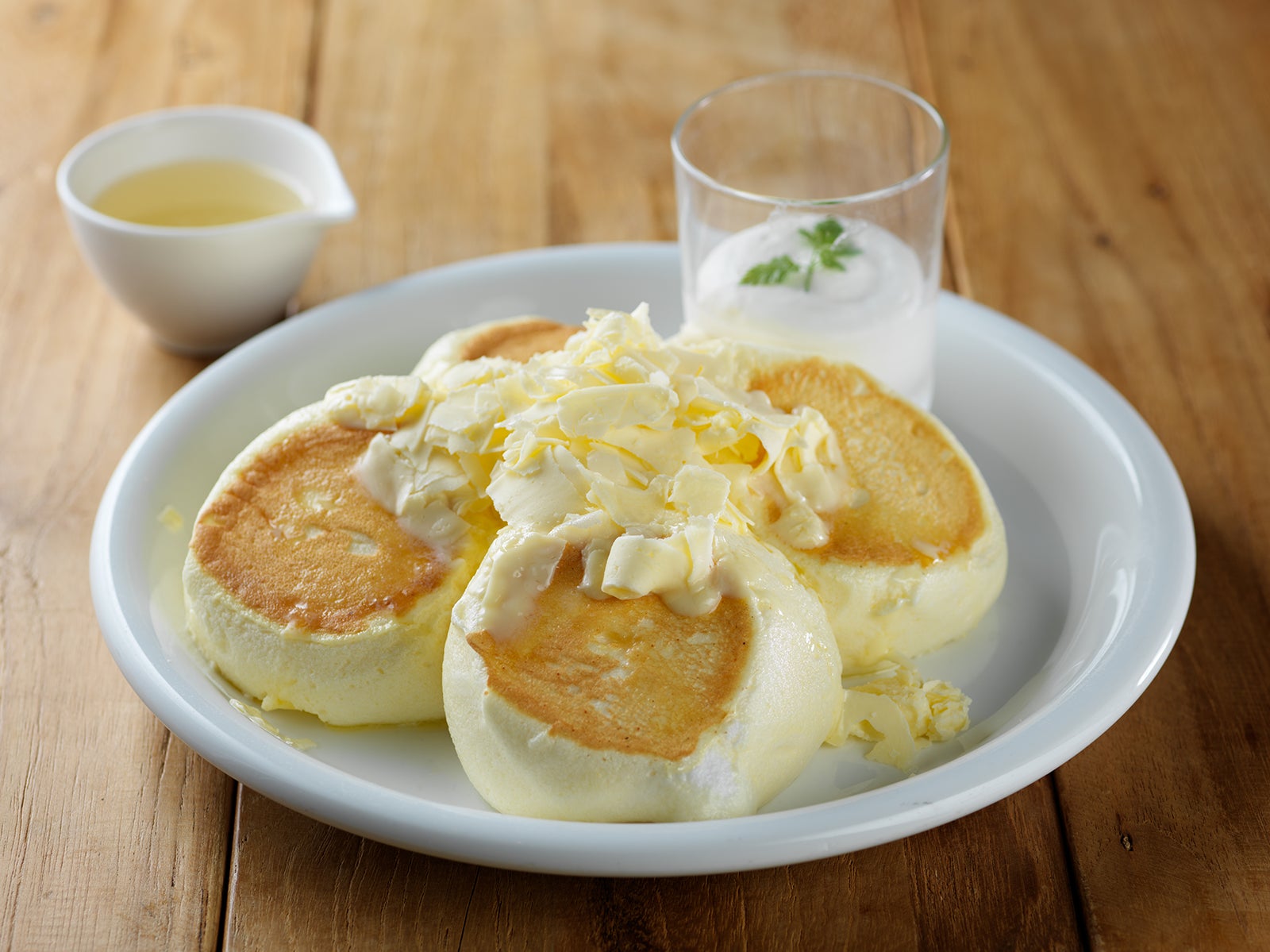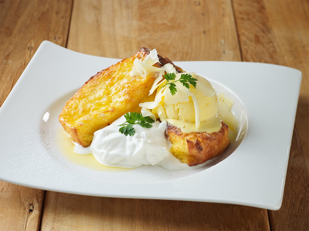 甘酸っぱいヨーグルトブルーベリーアイスと味わい深いバナナアイスの2種類のアイスをトッピング。香り高いはちみつソースをたっぷりとかけて、パンケーキとのマリアージュをお楽しみください。