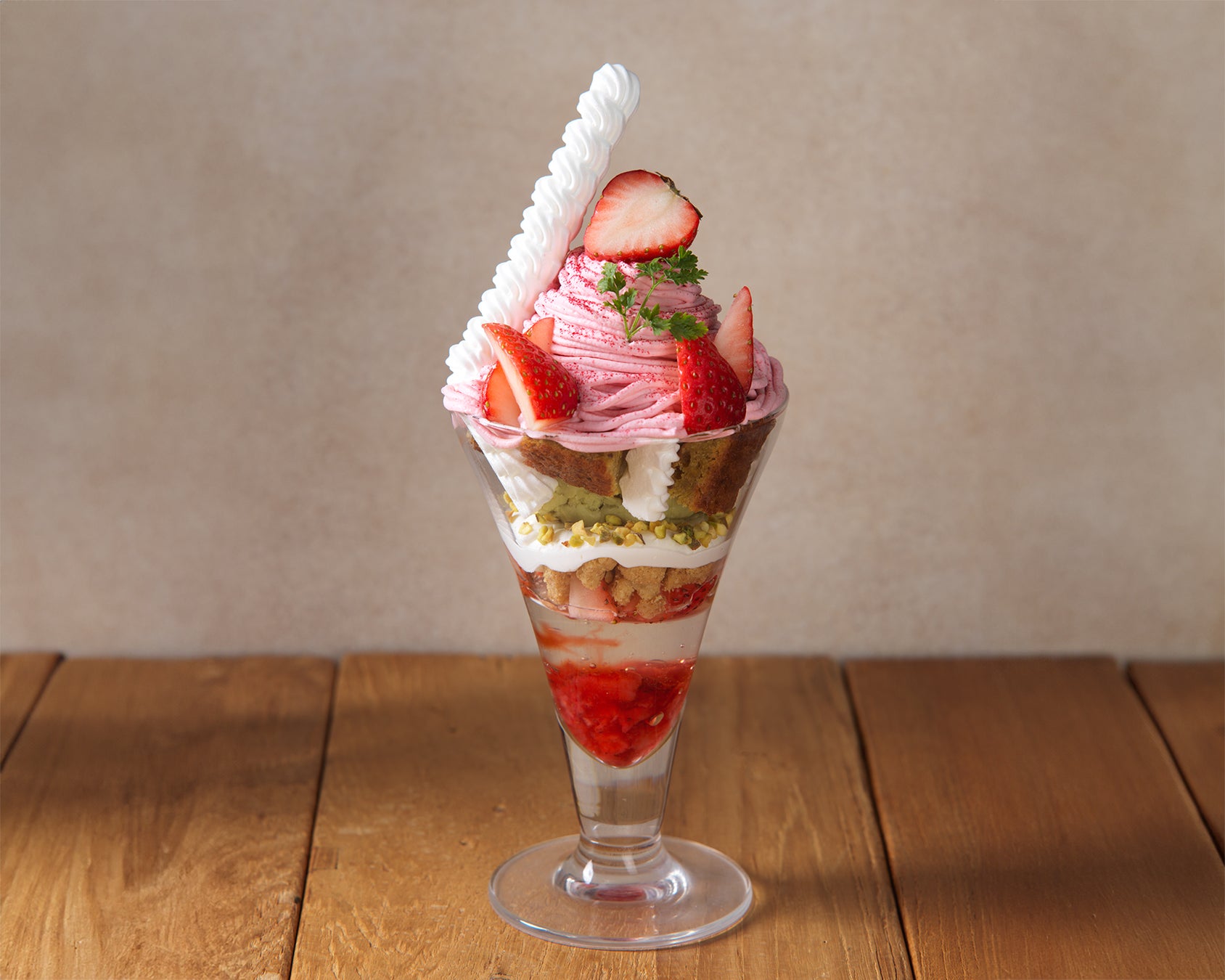 苺の酸味とピスタチオのコクの調和をお楽しみいただける、4月限定パルフェ。