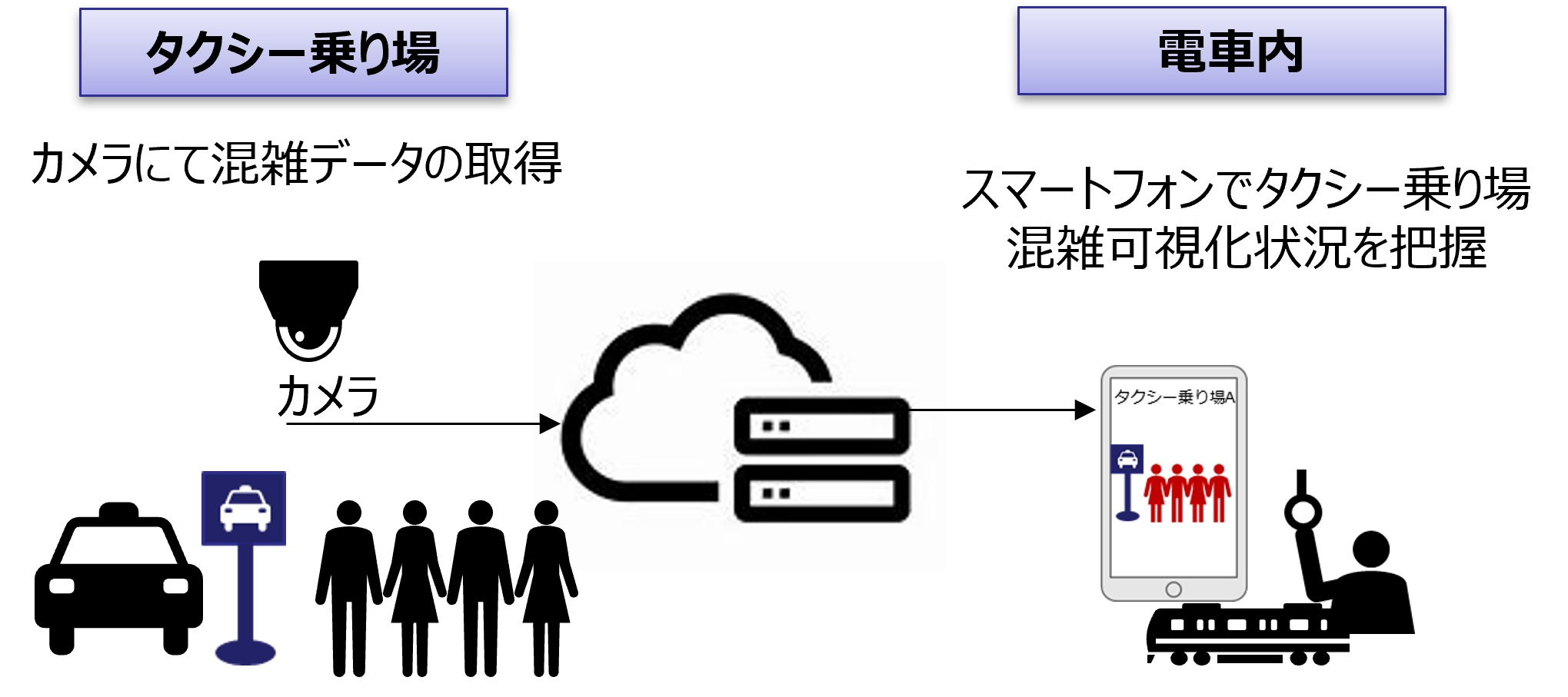 複数駅のタクシー乗り場の混雑情報を可視化し、ユーザーの目的地までの行動計画の変化およびタクシー乗り場の混雑緩和を検証します。