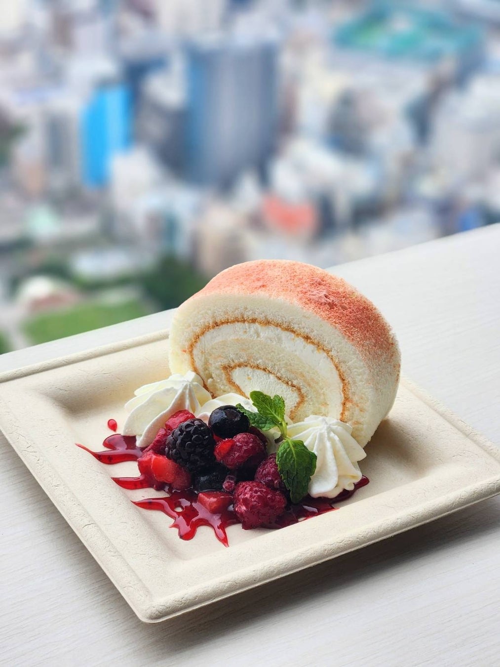 月に見立てたロールケーキをストロベリーパウダーとベリーで彩りました。ベリーの甘酸っぱさとロールケーキの優しい甘さが口の中に広がります。