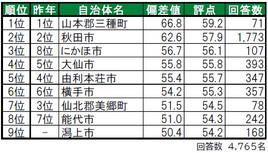 住み続けたい街は1位は2年連続で山本郡三種町。2位は3年連続で秋田市。3位にかほ市。