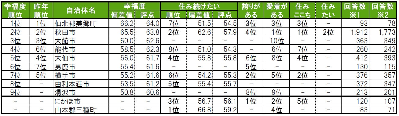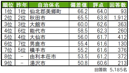 街の幸福度1位は3年連続で仙北郡美郷町。2位と3位は2年連続で秋田市と大館市。