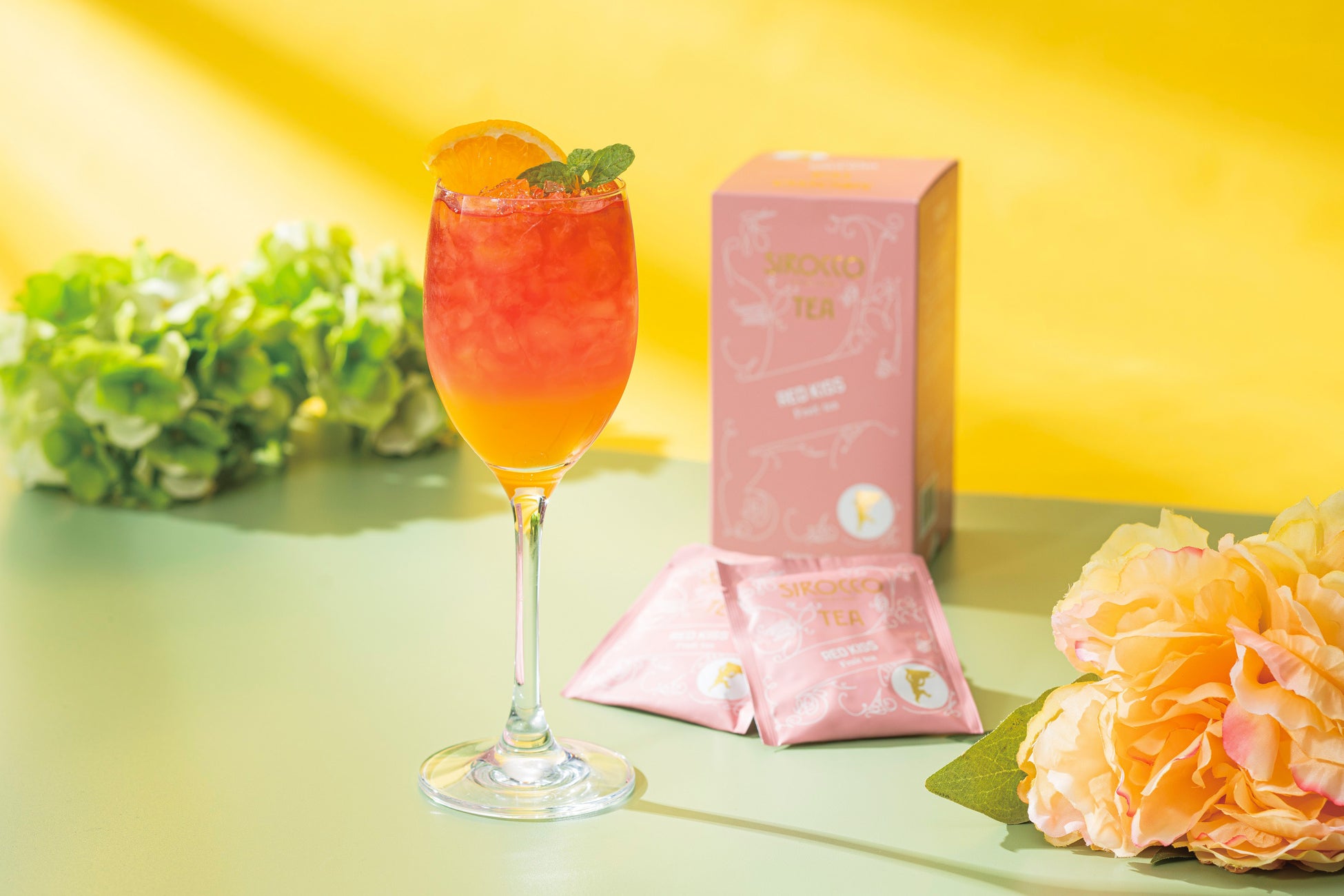 太陽の光をたっぷりと浴びたエルダーベリー、オレンジ、リンゴそしてハイビスカスやローズヒップなどをブレンドした「レッドキス」と、南アフリカでBio栽培されたルイボスティーにタンジェリンをブレンドした「ルイボスタンジェリン」の2種類のSIROCCOティーをブレンドしたベースに、オレンジジュース、マンゴーシロップ、洋梨シロップを合わせて涼やかなアイスティーに仕あげました。