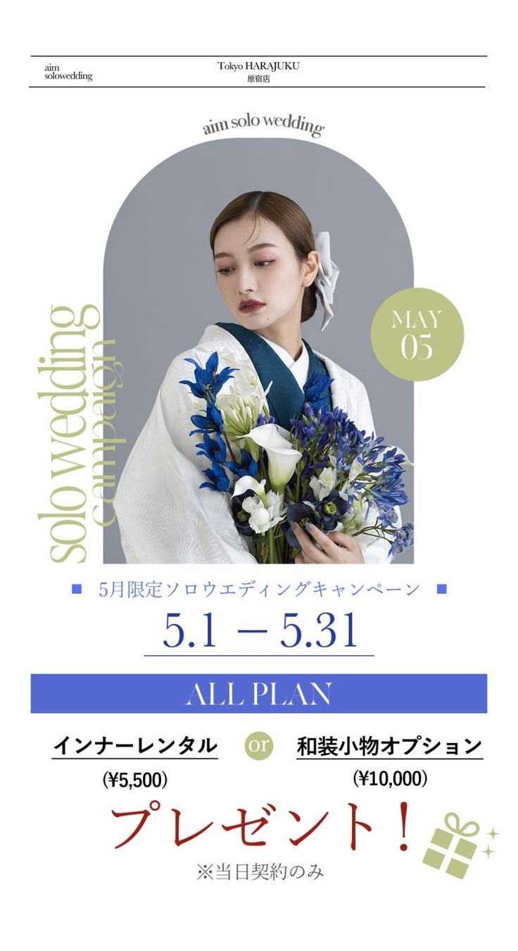 aim東京原宿店5月のキャンペーン情報をお届けいたします!フォトウェディングの際のお得情報やソロウェディングキャンペーンも一緒にご紹介しております。