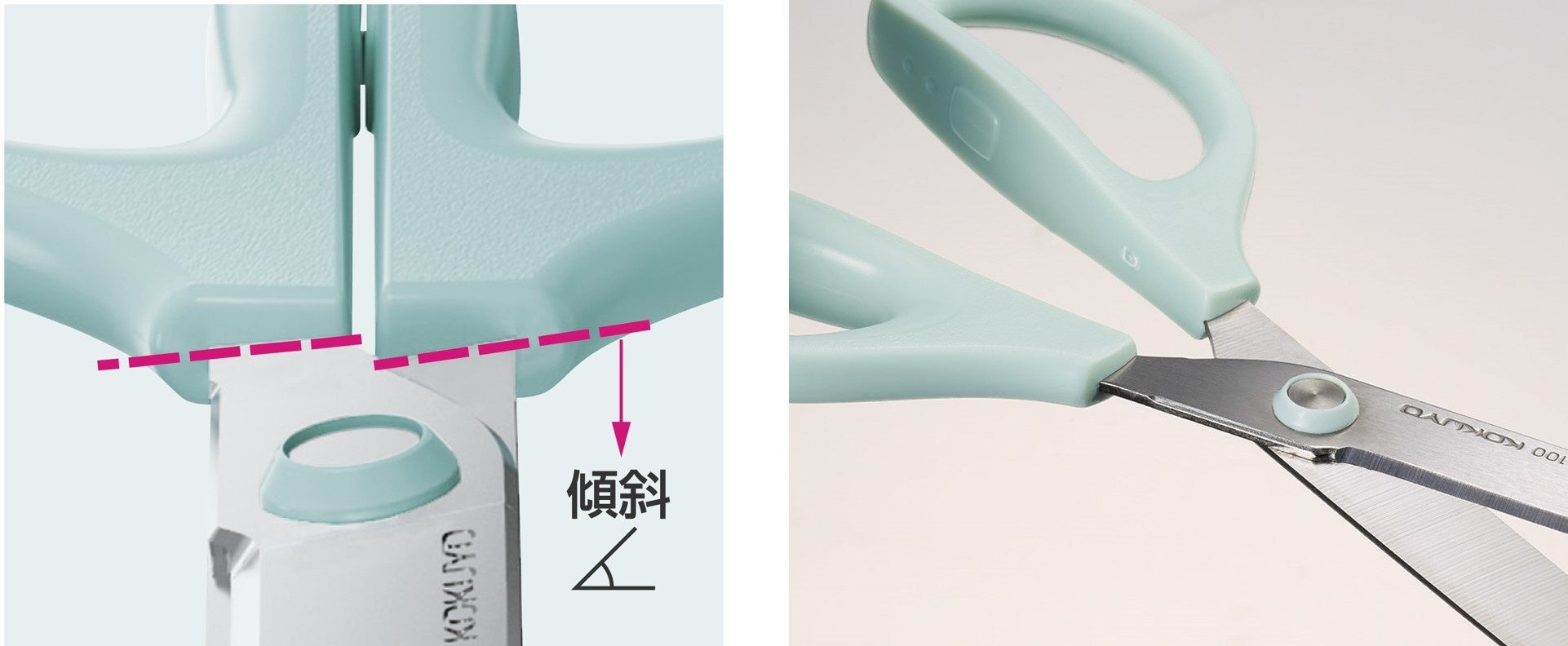今回のリニューアルに際して、ハサミ業界初(*2)の『傾斜インサート』構造を搭載しました。『傾斜インサート』とは、ハンドルに対して刃を傾けて成型する手法のことです。ハンドルを開閉するだけで刃と刃の隙間が小さくなるよう作用するため、使用者の利き手や技量に関わらず切りやすく、特にビニールのような薄いものに対して効果を発揮します。