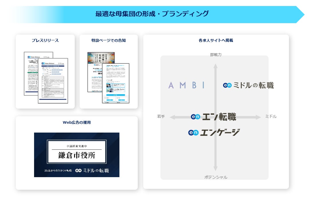 プレスリリースや特設ページ、Web広告での告知に加え、各求人サイトでの集客サポートを実施いたします。『エン転職』『エンゲージ』『AMBI』『ミドルの転職』とターゲットの異なる4つの求人サイトを活用することで、ターゲットへ網羅的に求人を届けます。