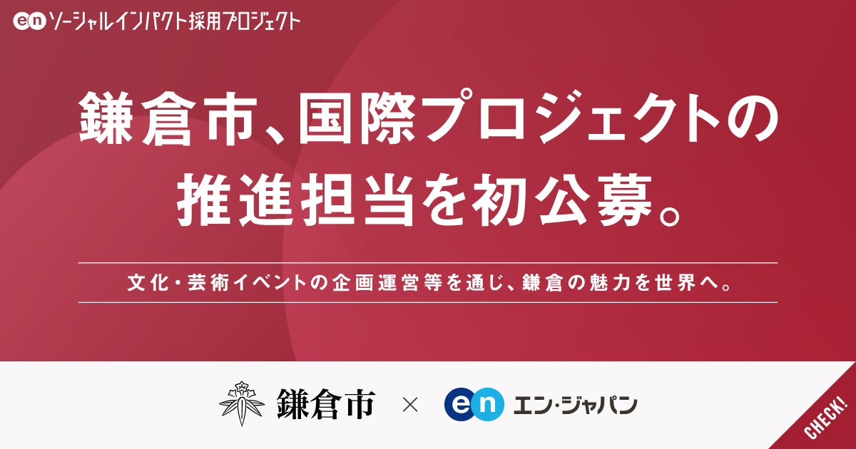 エン・ジャパン株式会社(本社:東京都新宿区、代表取締役社長:鈴木孝二)は、2025年1月30日(木)より、鎌倉市の『ソーシャルインパクト採用プロジェクト』(https://www.enjapan.com/)を開始しました。当社が運営する採用支援サービスを通じ、鎌倉市初となる「国際文化交流事業の企画調整担当」を公募します。下記、本プロジェクトの概要と、鎌倉市のコメントを紹介します。