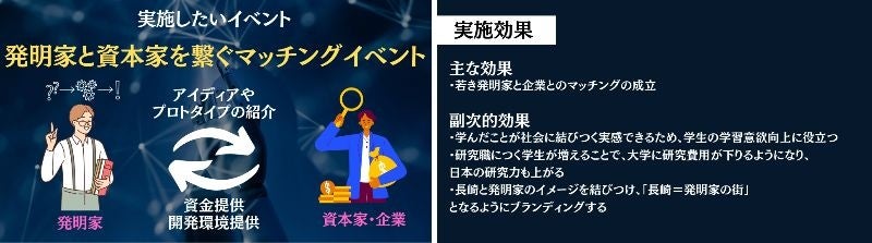 ・高校生や大学生の学び意欲の低下、日本の研究力の低下という社会課題に応える、若年層発明家と資本家をマッチングするイベント開催を提案。