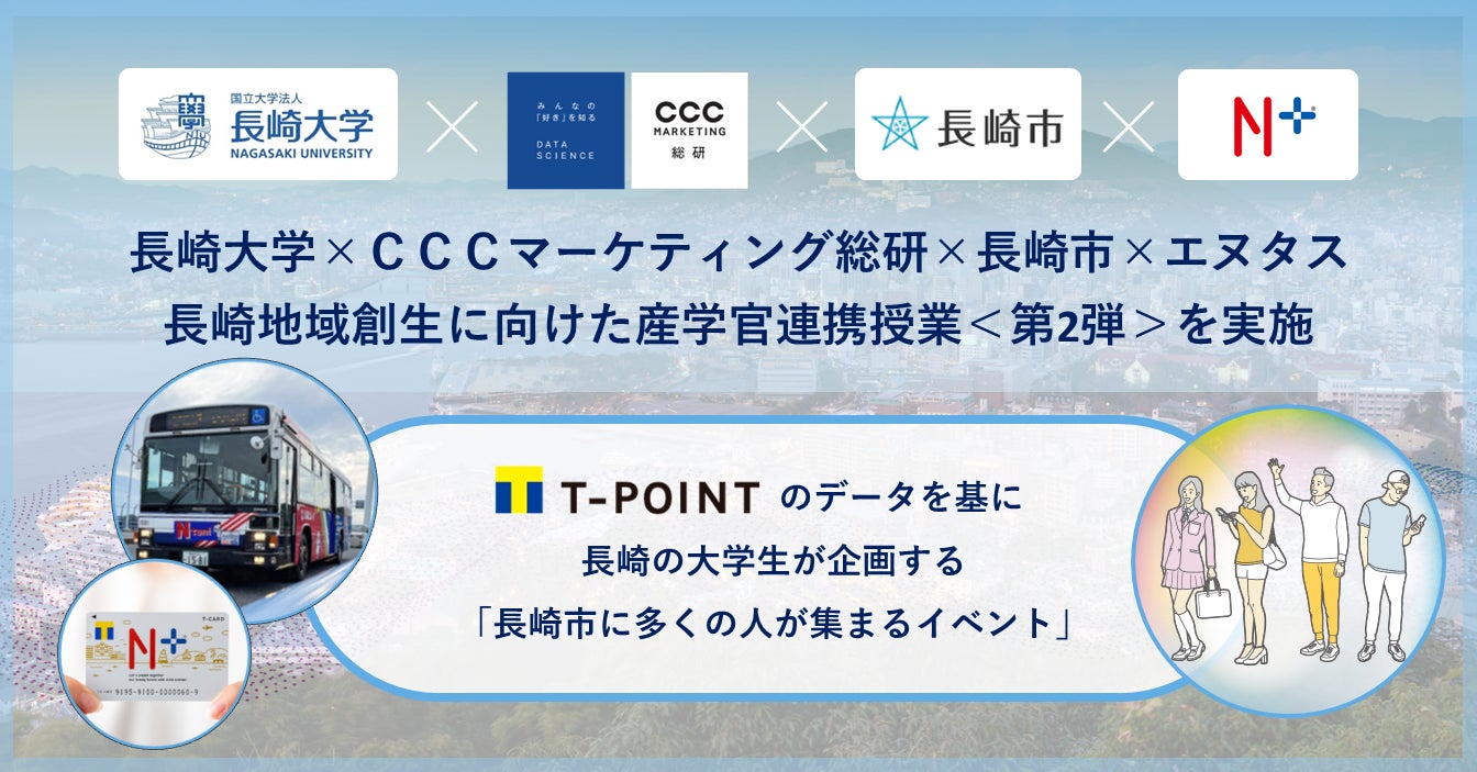 2022年より開始した産学官連携授業では、長崎大学 情報データ科学部にてデータマイニング・観光政策・観光ビッグデータを専門分野とする一藤裕准教授の講義「社会・観光情報学Ⅰ」を受講する学生が、統計加工化したTポイントの購買データに加え、地域ICカード「エヌタスTカード」における長崎バスの乗降に関わる統計加工データを基に、地域創生に向けた企画提案をする取り組みです。