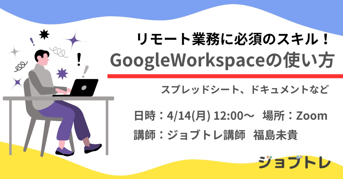 ワークキャリア株式会社(所在地:東京都港区、代表取締役:秋吉 正樹)は在宅勤務の可能性を広げるスキル獲得の第一歩というテーマで 4/14(月)12:00〜 参加費無料のGoogle Workspaceの使い方を学ぶセミナーを開催します。