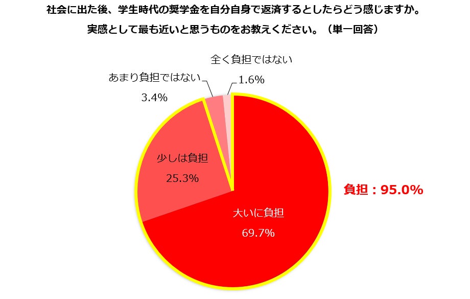 当社の調査(※2)によると、社会に出た後、学生時代の奨学金を自分自身で返済することについて95%が「負担」と回答しており、物価高騰が続く中でその負担はさらに増していると考えられます。