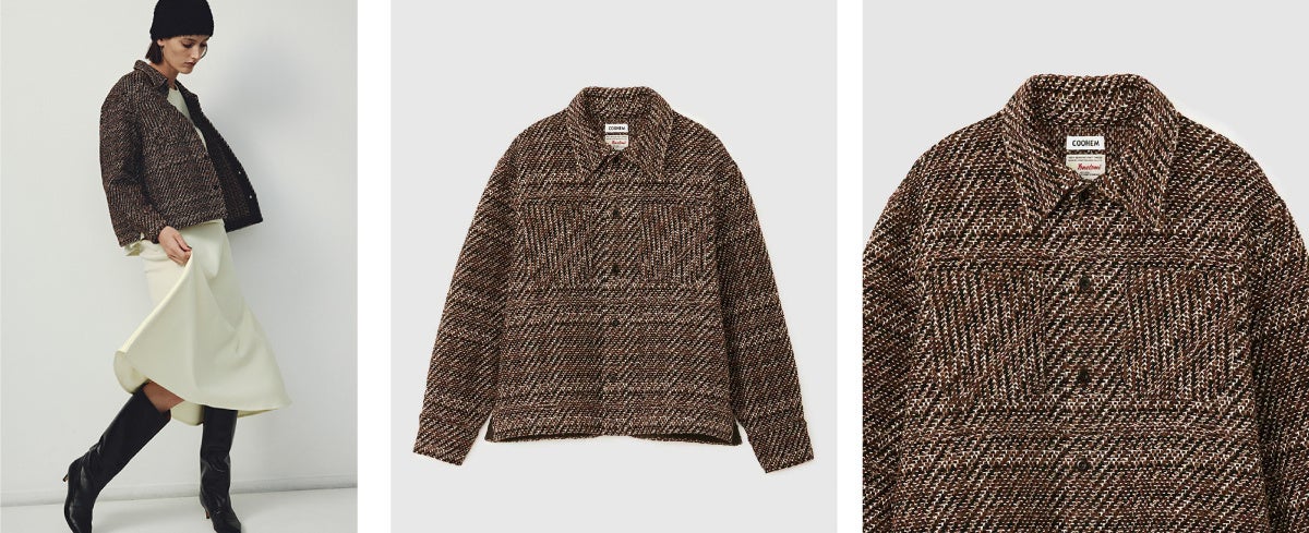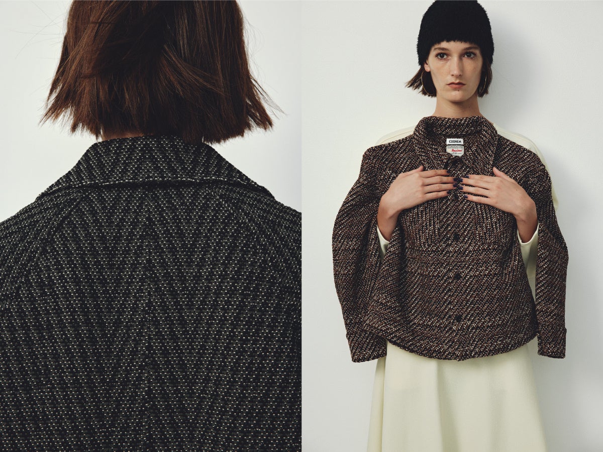 COOHEM の代名詞であるコットンナイロンキュプラのファンシーヤーンによるニットツイードを使用