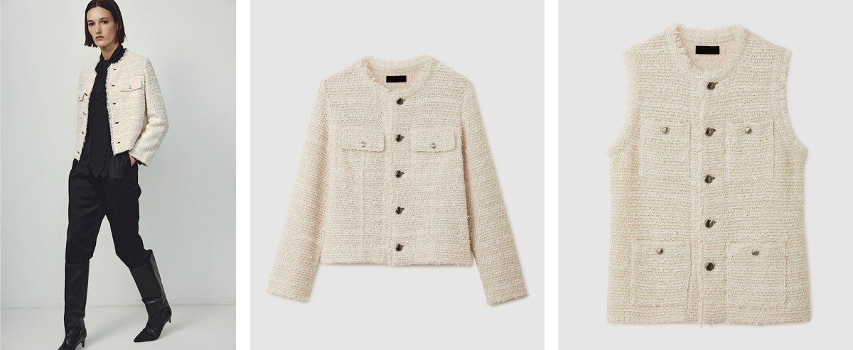 した、ノーカラージャケットとベストをエクリュカラーで別注。綾織りを思わせる斜め柄と、ベーシッ