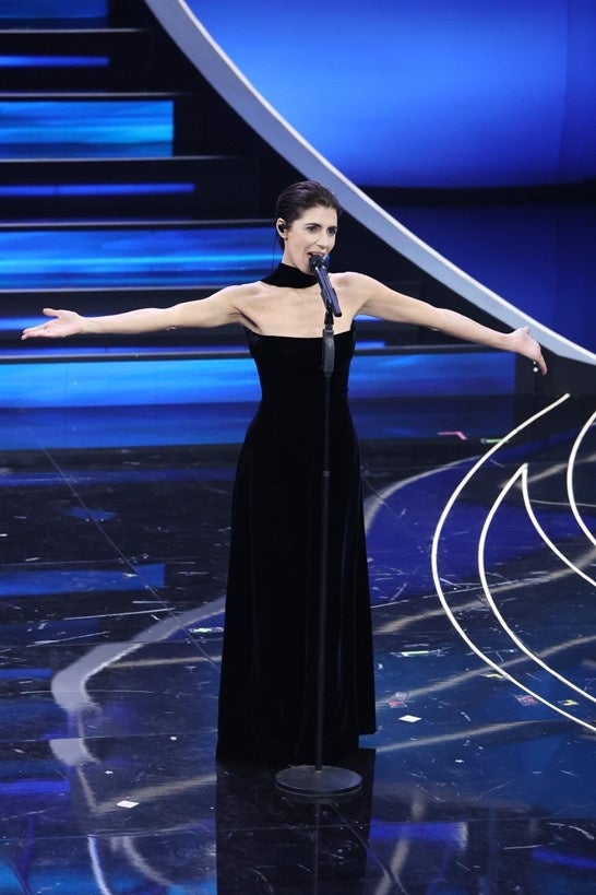 第73回サンレモ音楽祭に出演した歌手のジョルジャはマリア・グラツィア・キウリによるオートクチュールコレクションから、ネイビーブルーのスパンコールが輝くシルククレープのセットアップと、ブラックのジャンプスーツを纏い登場しました。