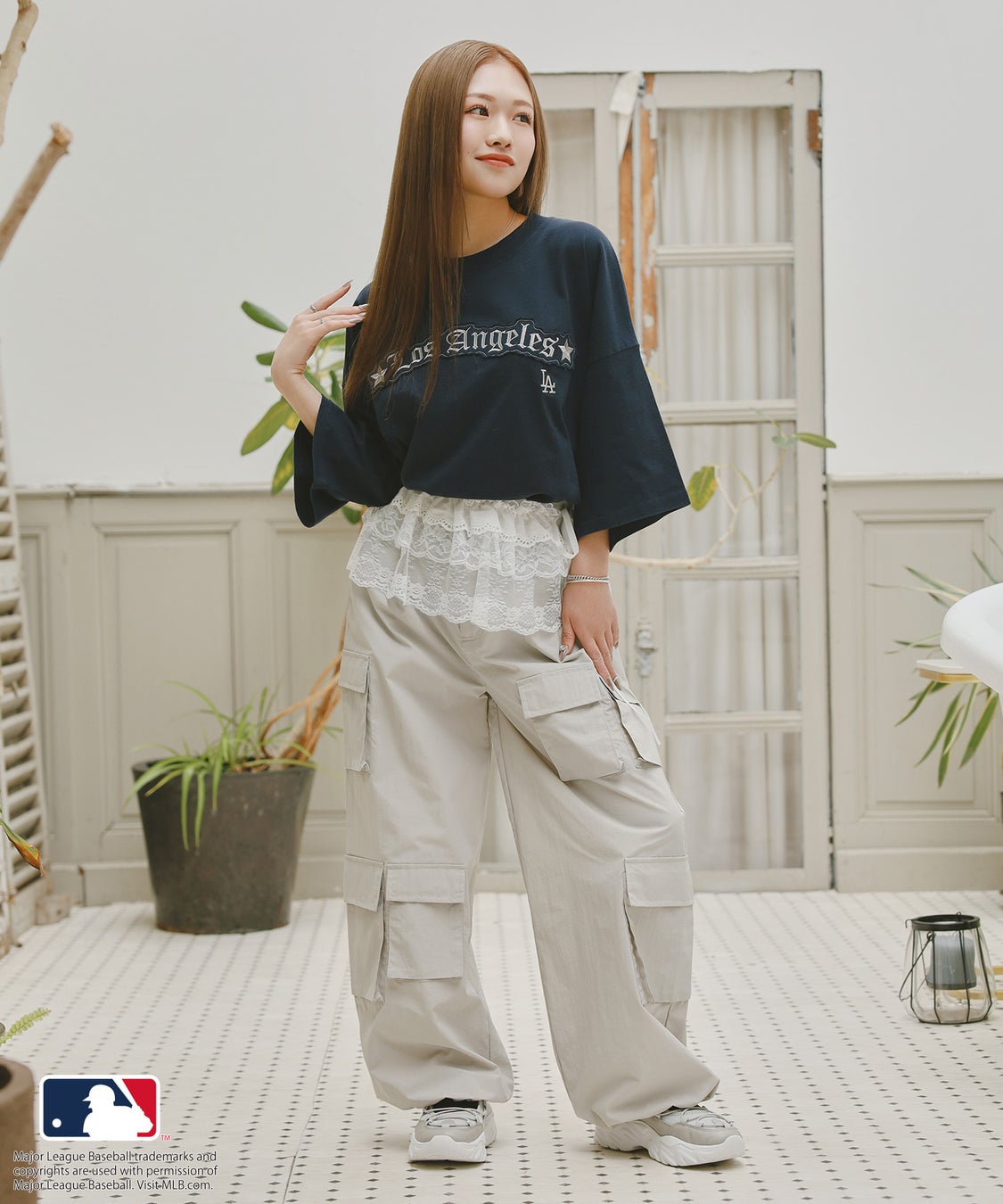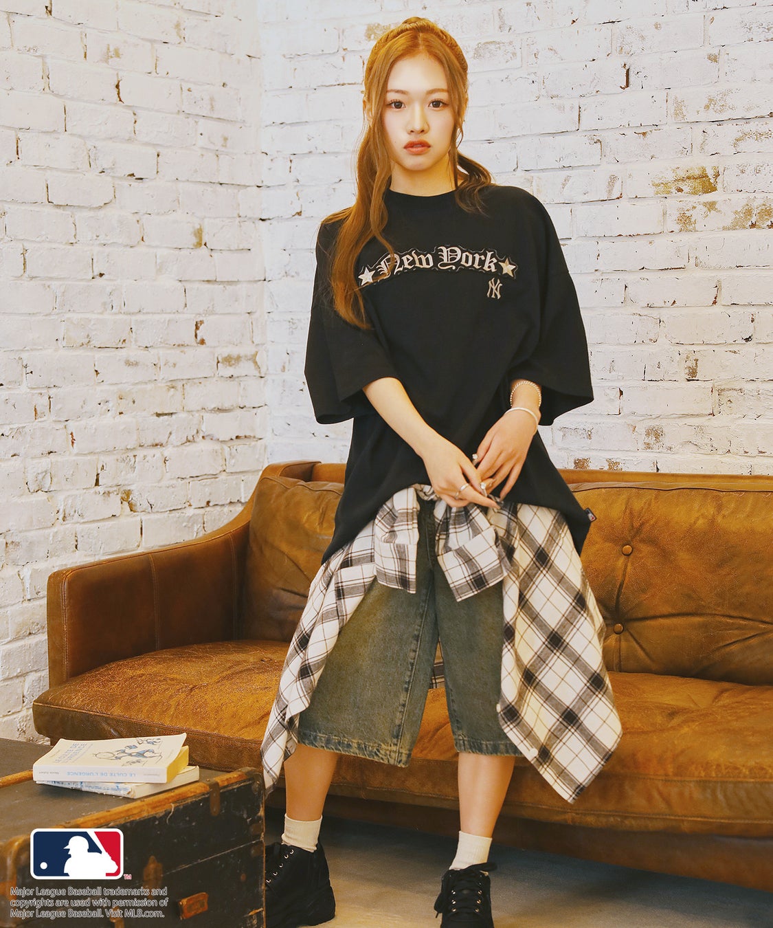 BIGサイズのTシャツに巻きスカートや迷彩柄のスカートを取り入れ、ストリートスタイルの中にトレンドアイテムをプラスしたスタイリングを提案。