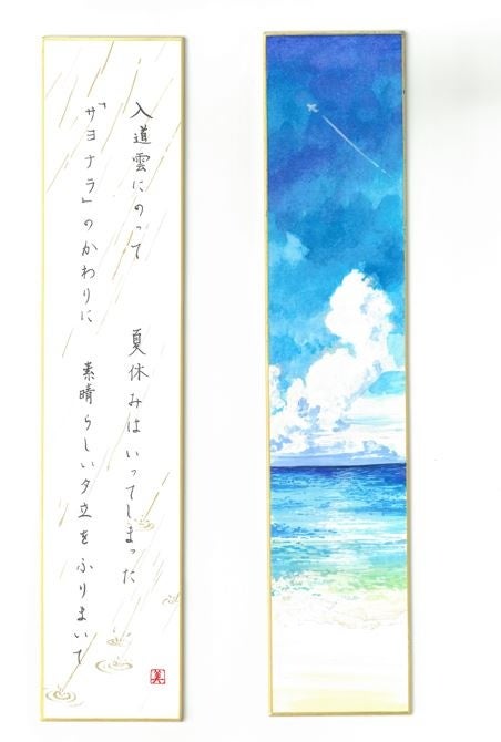 大佛次郎と鏑木清方の短い文章からイメージを広げ、初心者向けの日本画材(角顔彩)を使って2枚の短冊に絵と詞を描きます。初めての方でも安心して参加できるワークショップです。