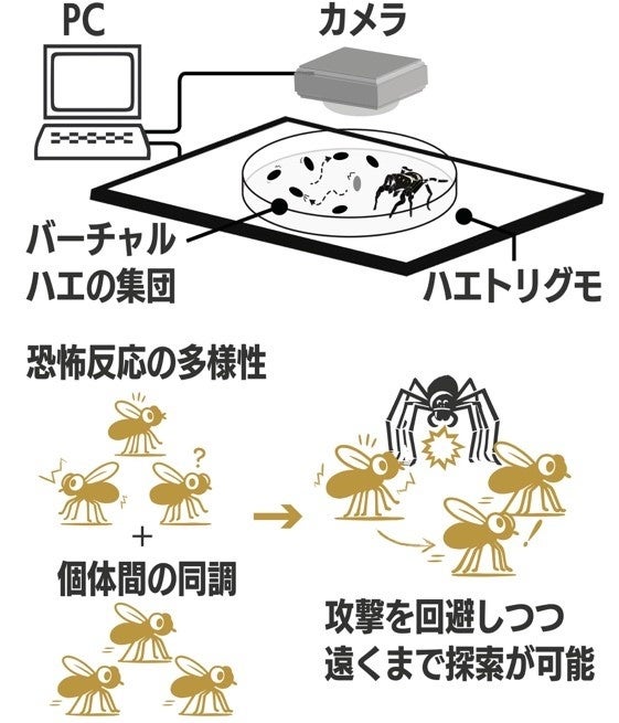 次に、集団内の行動多様性の役割に着目し、遺伝的に異なる2系統を様々な組み合わせで混成した集団を作成し、同様の行動実験を行いました。その結果、混成集団の個体は刺激直後に限り、それぞれの単一系統集団の平均値(期待値)よりも強い恐怖反応を示すことが分かりました。そこで、その生態学的意義を探るため、生物の行動を仮想的に再現するAgent-based model(注5)を用いて、実際のハエの動きに似せたエージェント(バーチャルハエ)をディスプレイ上で動かし、捕食者であるハエトリグモに提示しました。また、クモの動きに応じてバーチャルハエの動きを操作する(クモが近づくとフリージングする)というAnimal-computer interaction(注6)の手法に加え、個体ごとにフリージング時間を設定し、集団を構成する個体がどのように動くとクモに襲われやすいか、あるいはうまく逃げられるかを検証しました。