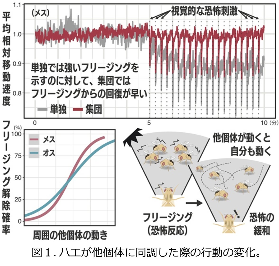 千葉大学国際高等研究基幹・大学院理学研究院の佐藤大気特任助教、高橋佑磨准教授の研究チームは、ショウジョウバエが天敵などの視覚的な脅威に対してどのように反応するかを解析し、恐怖反応とその緩和に周囲の個体の行動が大きく影響していること、そしてそのような個体間相互作用に関わる遺伝的な基盤を明らかにしました。また、恐怖反応の程度に多様性があり、かつ他個体への同調が存在すると、捕食者に襲われづらくなるといった集団としてのメリットが生じることを発見しました。さらに、集団において生じる、「多様性効果」に関わる遺伝的変異を検出する新たなゲノム解析手法を提案しました。