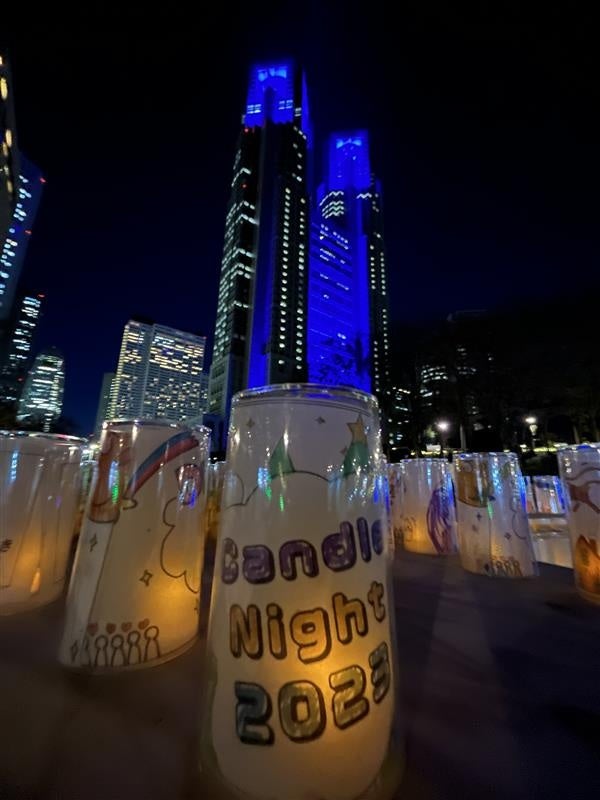 新宿西口高層ビル群の夜景を背景に、参加者にぬり絵で装飾いただいた約3,000個のキャンドルが会場を彩る、お子さまから大人の方までどなたでも気軽にお楽しみいただけるイベントです。