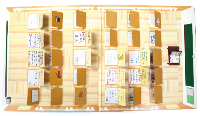 机型のカードにコメントを書いて、自分達の座っていた机の配置通りに貼りつけます。開くとメッセージが読め、楽しかった学校生活が記録にも記憶にも残る色紙です。