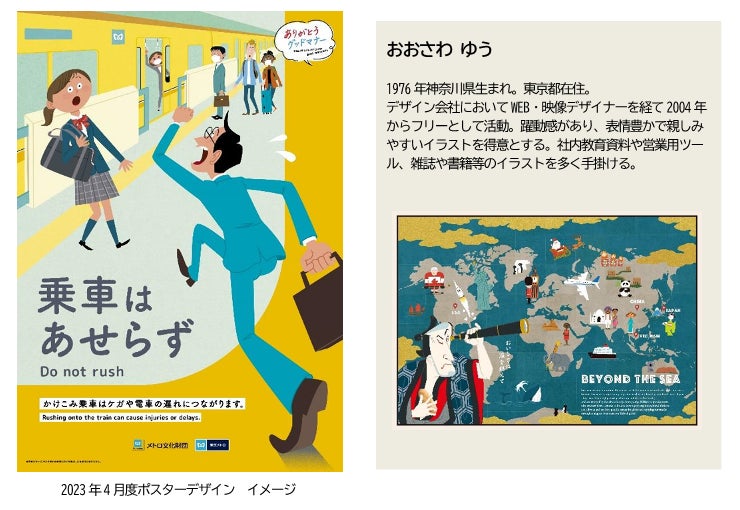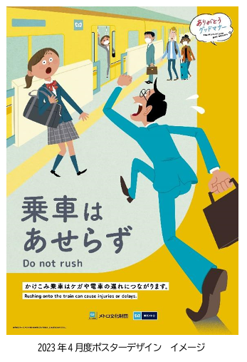 東京地下鉄株式会社 (東京都台東区、代表取締役社長:山村 明義、 以下「東京メトロ」)は、2023年4月から2024年3月まで、(公財) メトロ文化財団 (東京都千代田区、会長:奥 義光) が作成するマナーポスターを駅構内及び電車内に掲出し、すべてのお客様が快適に地下鉄をご利用いただけるよう、マナー向上へのご協力を呼びかけます。