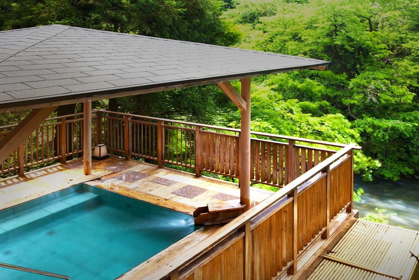 美しい山中温泉の街並みと「鶴仙渓」が眺められる屋上に新設したウッドデッキで、早朝の天空ヨガ、夜にはルーフトップ星空観察、抹茶、みずひき体験などが、今春から新しく、吉祥のおもてなしに加わりました。