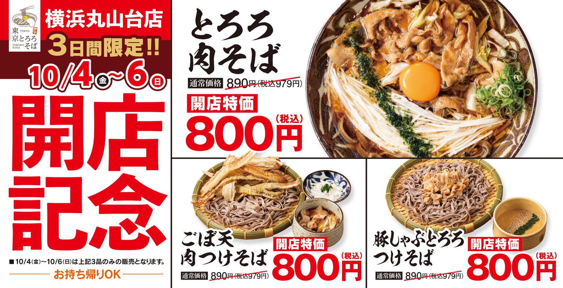 10月4日(金)~6日(日)の3日間は、かけ派にも、つけ派にも選ばれることを目指してそばやスープを刷新した代表メニュー3品「とろろ肉そば」、「ごぼ天肉つけそば」、「豚しゃぶとろろつけそば」を開店記念特価の800円(税込)で販売いたします。