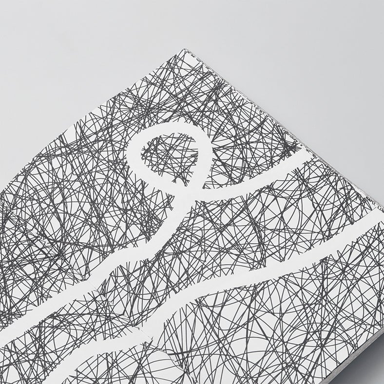 黒い曲線で覆われた紙面に1本の白い道が走るデザインになっており、紙面デザインは全ページで異なります。黒い曲線部分に書かれた文字は視認性が落ちるため、残したくない言葉や感情を書き出す際に適しています。ノートの小口や綴じ部分で白い線がずれないよう印刷データを調整して製造しています。