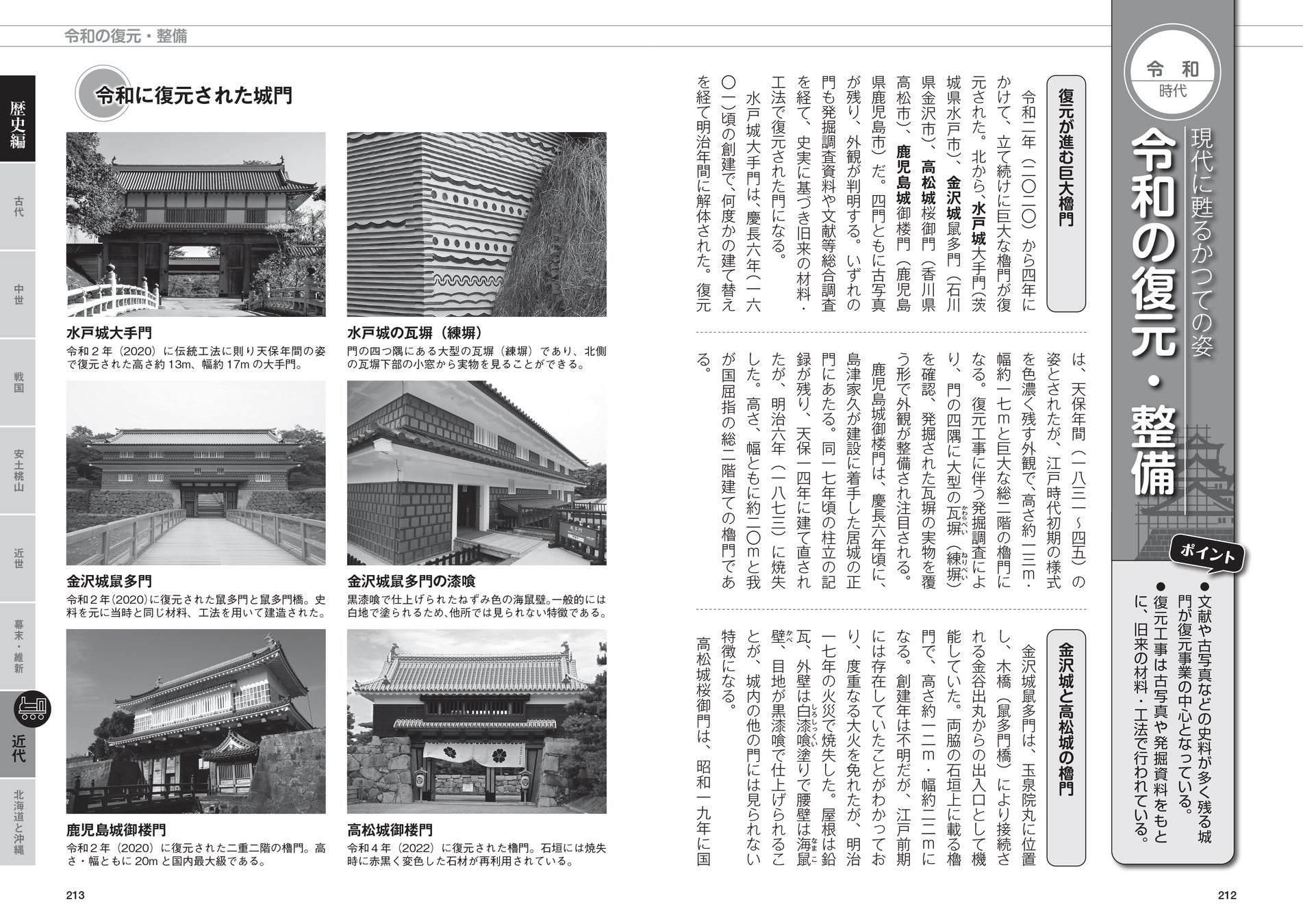 さらに、幕末から明治の廃城令や太平洋戦争で城が置かれた厳しい環境や、戦後から令和に至る復元・整備の状況など、歴史から地続きの“城の今”もわかります。