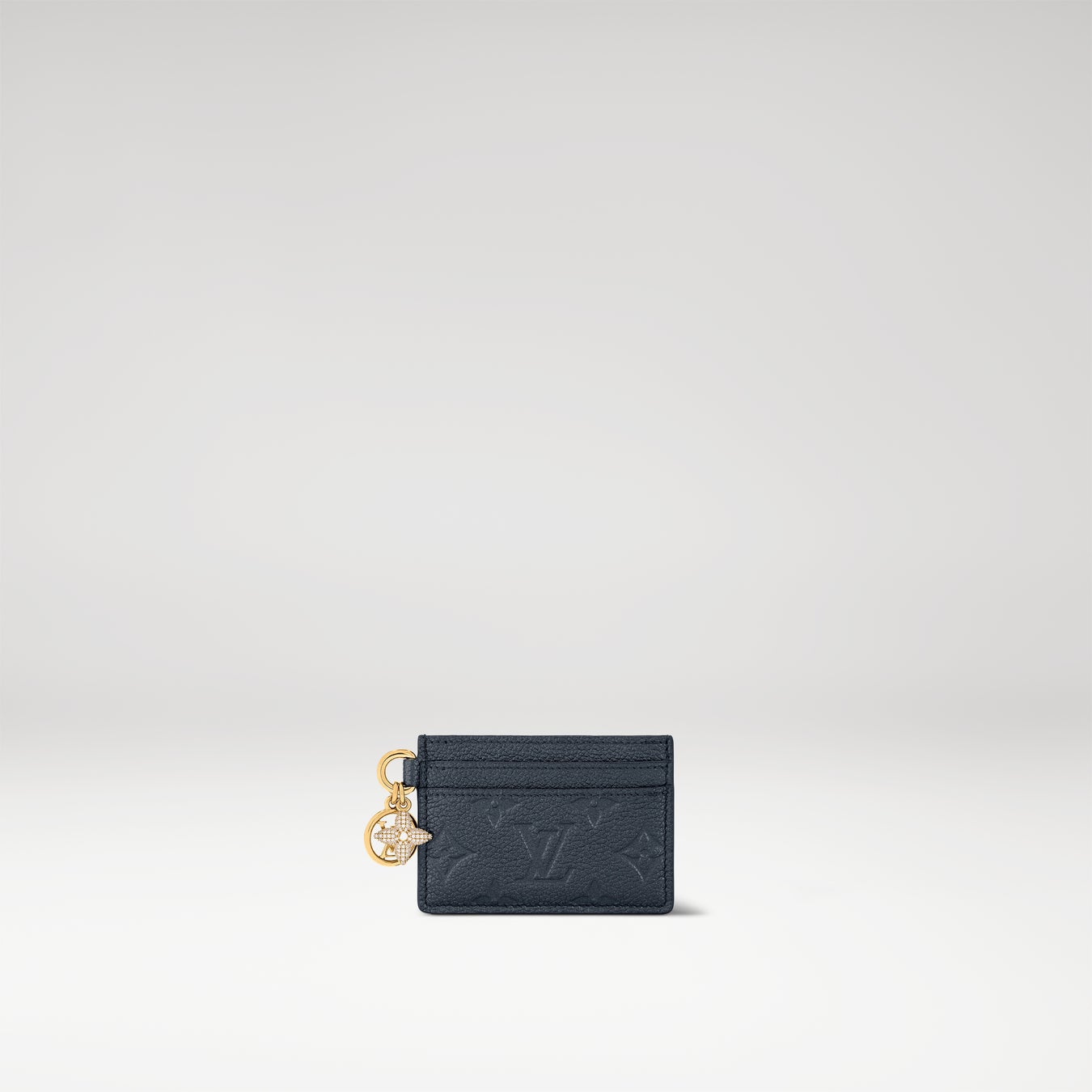 「カードケース ポルト カルト・LV チャーム」は、2つのモノグラム・モチーフのチャームをあしらい、うち1つにはきらめくストラスが散りばめられています。クレジットカード、交通系カード、名刺などを収納できる5つのスロット(各サイドに2つずつ、中央に大ぶりのスロット1つ)を備えています。