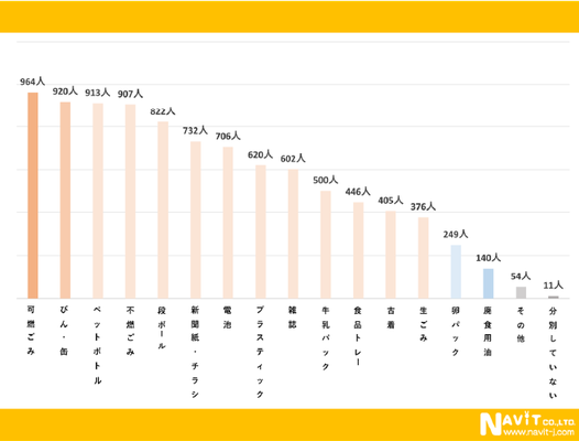 複数回答でアンケートを答えていただきました。全体的に非常に多くの方が分別を行なっており、「可燃ごみ」が964人、「びん・缶」が920人、「ペットボトル」が913人、「不燃ごみ」が907人と、900人を超える回答が多かったです。その他も多くの選択肢がありましたが、細かく分類をする方が多いようです。