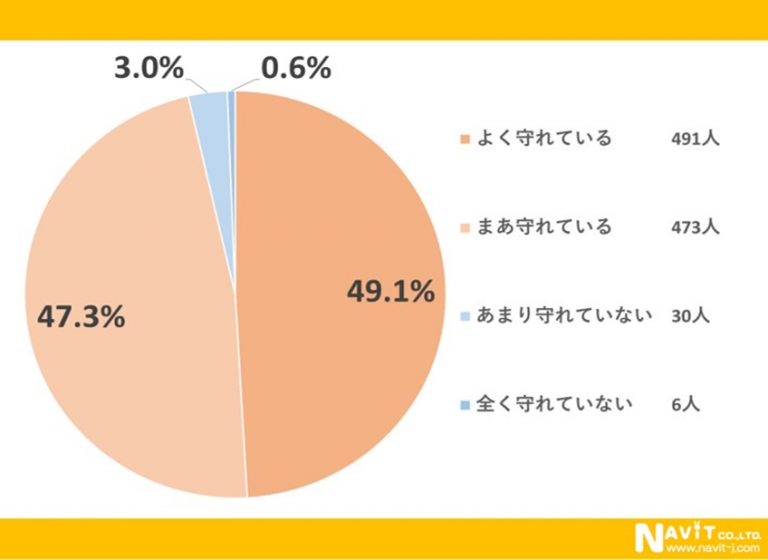 「よく守れている」という方が49.1%で半数近くとなっています。「まあ守れている」という方の47.3%と合わせると96.4%と高水準となっています。