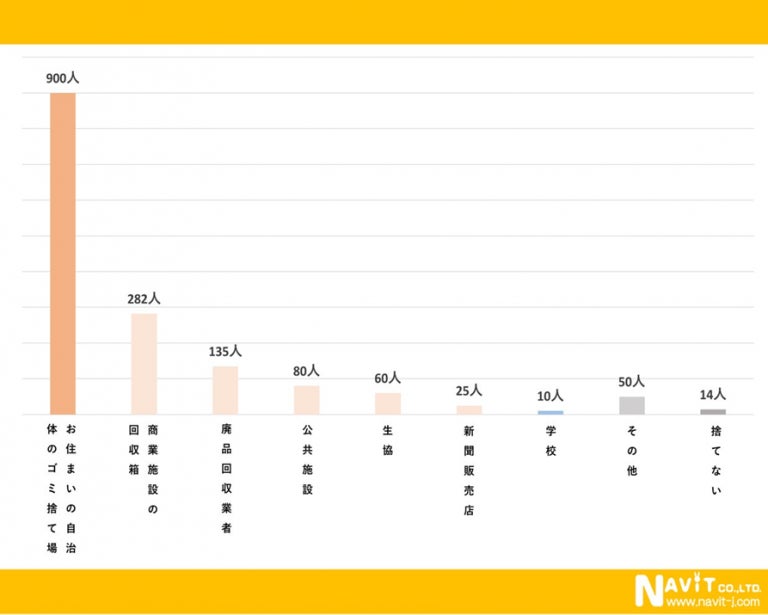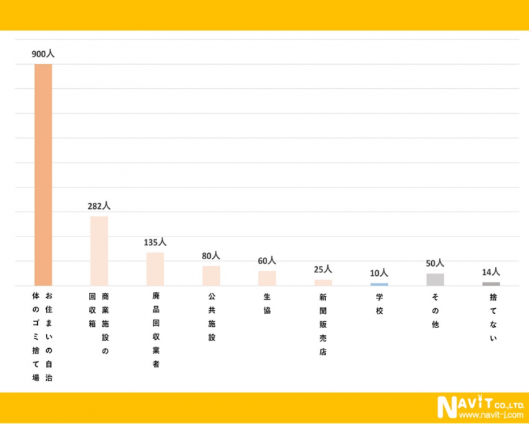 ゴミの回収については「お住まいの自治体のゴミ捨て場」が900人と一番多く、その次からはぐんと下がって「商業施設の回収箱」が282人でした。スーパーなどにアルミ缶やトレーの回収ボックスがあるので、そこに入れているのでしょうね。続いて「廃品回収業者」が135人となっています。