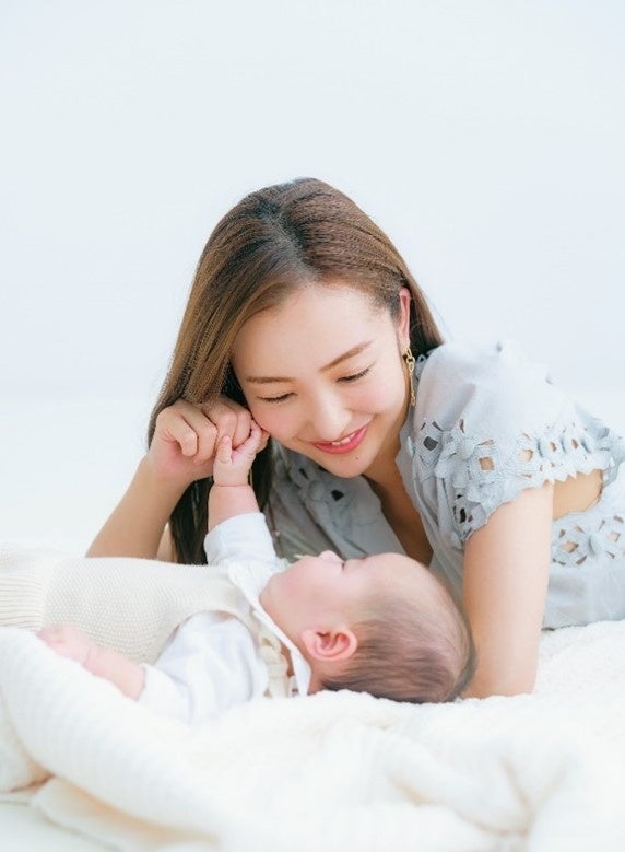 2021年秋にご出産された板野さん。板野さんのお子さんより少しだけ月齢が上の読者モデルの赤ちゃんを抱っこして、「うちの子よりちょっと大きいかな、少し重いかな、あともう少しでこんなに首がすわるんだ」などと話しながら、慣れた様子で抱っこしてあやしてくださり、笑顔を引き出してくれました。