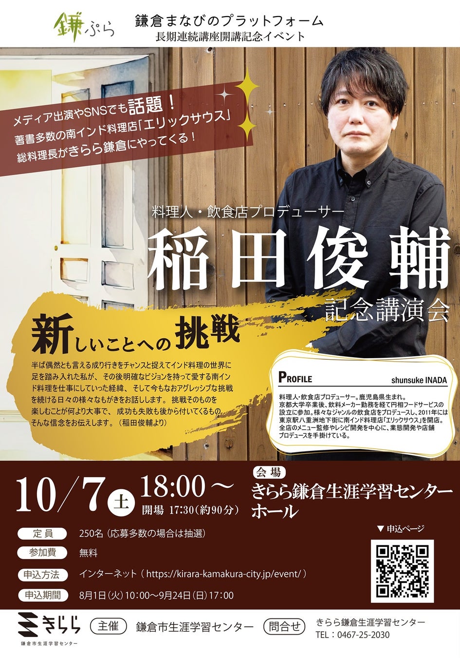 また10月7日(土)は開講を記念して、料理人・飲食店プロデューサー稲田俊輔(イナダシュンスケ)氏をお招きし、講演会を開催!テーマは「新しいことへの挑戦」です。