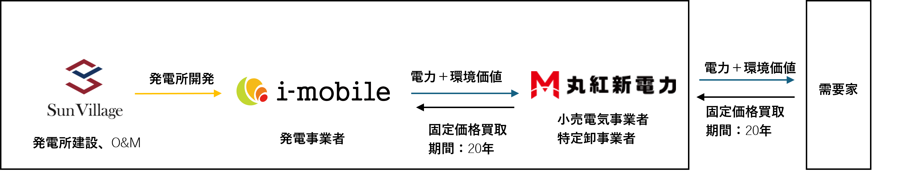 本協業はオフサイトPPAモデルにより、サンヴィレッジが開発した再エネ発電所を当社が太陽光発電事業者として保有し、発電される電気と環境価値を丸紅新電力が長期間にわたり調達し、需要家に再エネ電力あるいは環境価値を販売するものです。