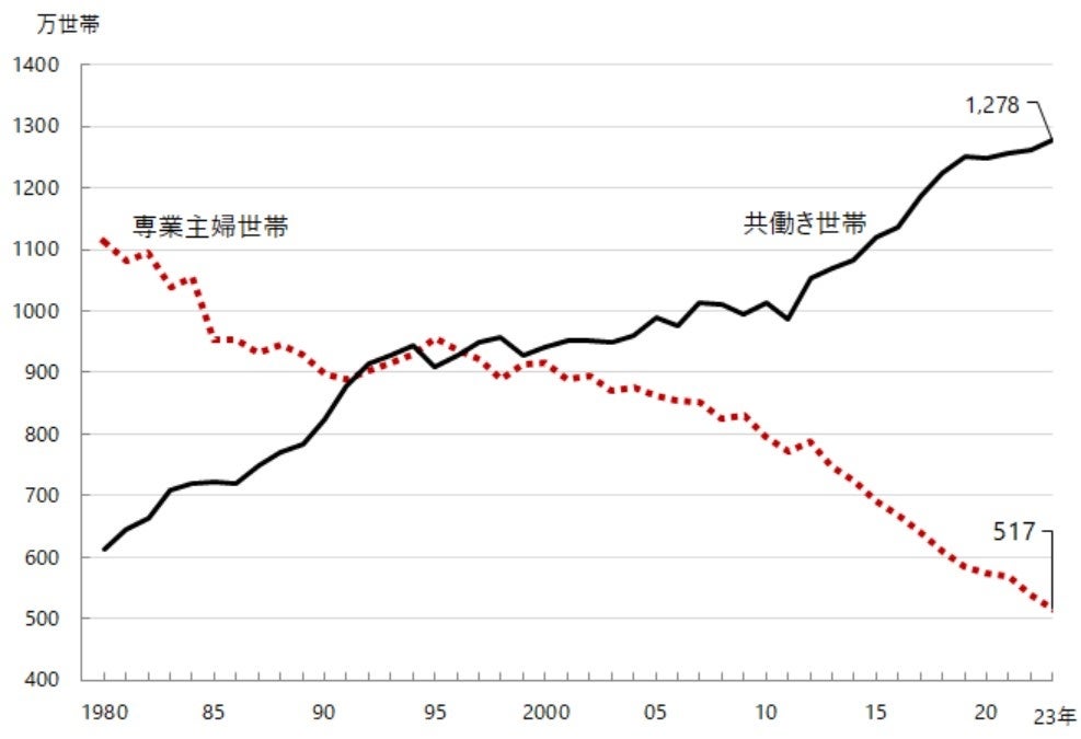 【専業主婦世帯と共働き世帯 1980年~2023年】