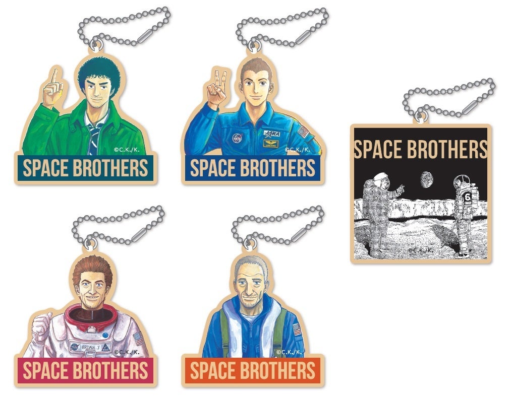 宇宙兄弟のムッタ、ヒビト、エディ、ブライアンの他、イベントメインビジュアルのアートを施したチェーンホルダー。