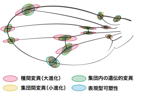 千葉大学大学院融合理工学府博士後期課程3年の斉藤京太氏、ルンド大学(スウェーデン)の坪井助仁博士、千葉大学大学院理学研究院の高橋佑磨准教授の研究チームは、ショウジョウバエの翅(はね)の形態に着目し、進化生物学における大きな謎である「短期的な進化と長期的な進化の関連性の成立機構」に関して新たな視点を提唱することに成功しました。本研究は、短期的に起こるミクロな進化(小進化)の積み重ねによって長期的なスケールで起こるマクロな進化(大進化)が形作られるという従来の説明(制約仮説)よりも、むしろ各生物が背負っている大進化の歴史が現在の生物がもつ『変異のしやすさ』というミクロスケールでの変化を形作るという逆方向の説明(整合仮説)を支持するものであり、従来の進化理論の見直しを促す重要な知見となります。