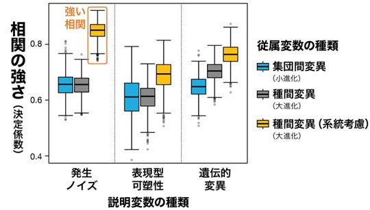 今回の研究では、ショウジョウバエの翅の形に注目し、その形態の変化パターンを個体内のノイズのようなミクロな階層から大進化のようなマクロな階層までの多数の生物学的階層(図1)で分析することで、進化のしくみに迫りました。研究チームは、①個体内に生じるごくわずかな形態の左右差(発生ノイズ(注1))、②育つ環境の違いによる形態の変化(表現型可塑性)、③同一集団内の遺伝的な形態変異、④同種の集団間の形態変異(小進化)、さらに、⑤過去の約4000万年で生じた種間での形態差異(大進化)の5階層で翅の形状を定量化し、それぞれのばらつきを分散共分散行列(注2)で表現し、比較しました。その結果、先行研究参考文献2)と同様、すべての階層間で翅の形のばらつき方が類似していることがわかりました。図2に示した通り、翅脈の交点ごとに形の変化のパターンを各階層で描いてみると、互いに類似していることがわかります(発生ノイズは翅の左右差として算出されるため、図示できない)。重要なことに、階層間で類似性の強さを比較してみると、「①発生ノイズによる形態変異」と「⑤種間での形態変異(系統考慮)(注3)」の間に、もっとも強い相関が認められました(図3)。この結果は「整合仮説」を強く支持するものです。一方で、従来の理論が予測するほどではなかったものの、「③遺伝的変異」と「④小進化:集団間変異」の間にも有意な相関が確認され、「制約仮説」の妥当性も一部支持されました(図3)。以上の結果は、変異から小進化や大進化へのボトムアップ的かつ一方向的な因果ではなく、大進化から発生ノイズのようなトップダウン的な因果の重要性や、生物学的階層での双方向的な因果が生物の形の多様性を形作っていることを示唆しています。